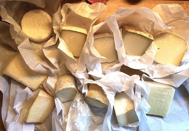 Doch dann ging es in die Pyrenäen, zuerst auf die okzitanische Seite, in den Naturpark der Grands Causses, karge Hochebenen, mit durch Einbrüche entstandenen Höhlen und Schluchten. Von dort stammte die Tommette des Grands Causses (4 Monate). Dieser Bruder des Bleu des Causses, ein halbfester Schnittkäse mit Naturrinde, demonstrierte sehr schön, wie diese ganze Familie ganz anders als die Bergkäse aus Kuhmilch nicht mit Frucht und Nussigkeit, sondern vor allem it Umami spielt. Der Chenin Blanc L’Insolite von Thierry Germain aus Saumur, als 2017 mit feiner Reife, begann eher leise, blühte aber mit dem Käse sehr auf (und war ein bißchen teurer als gedacht). Ardi Gasna, der „baskische Schafskäse“, der nicht von Hirten sondern in Käsereien produziert wird, vetrug sich in seiner festeren Art ebenfalls sehr gut mit dem Wein von der Loire.