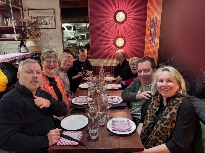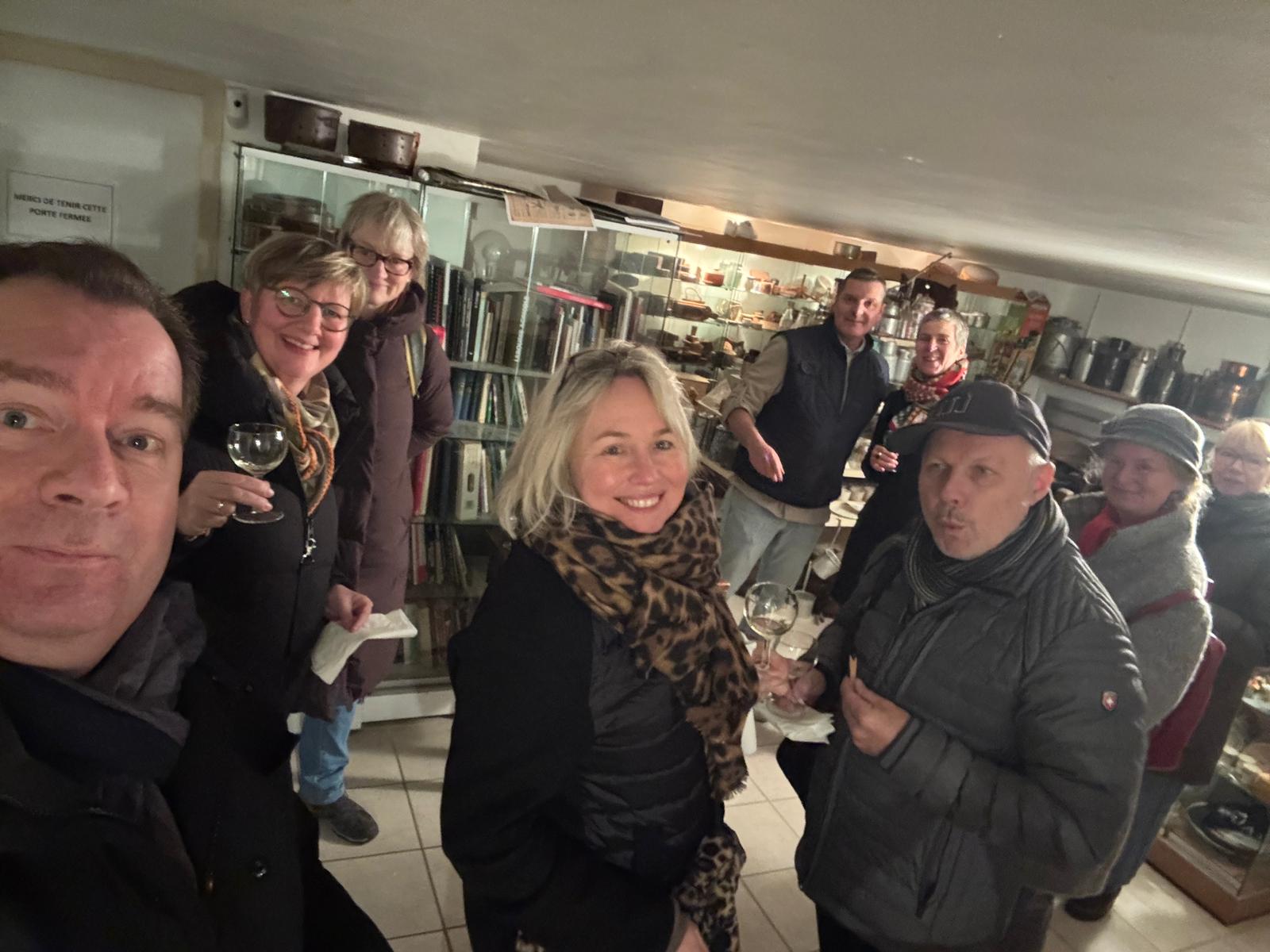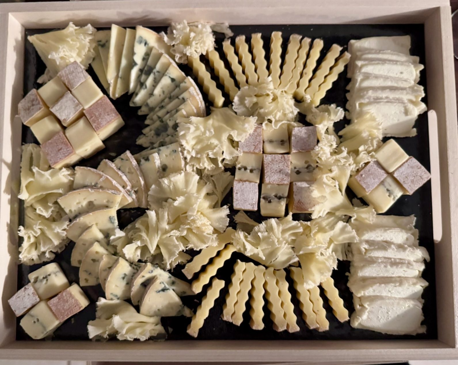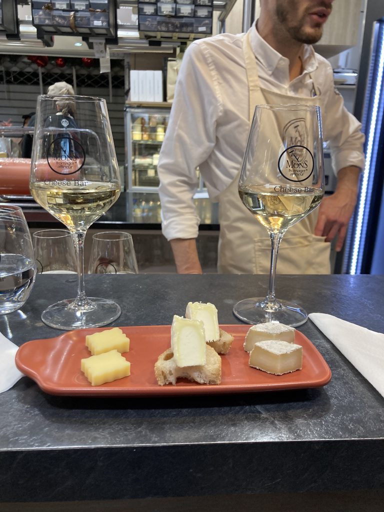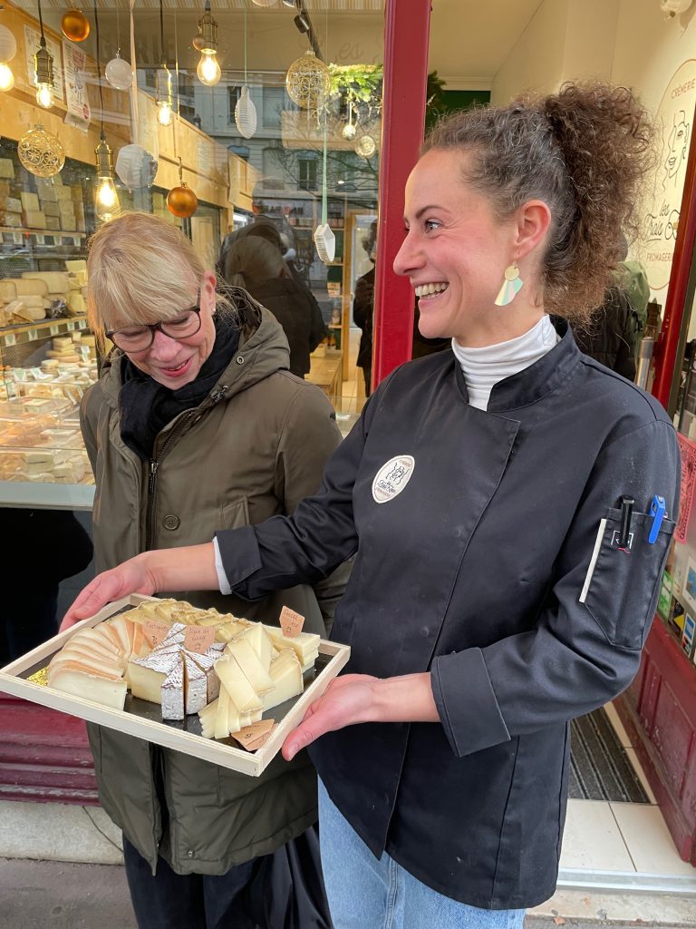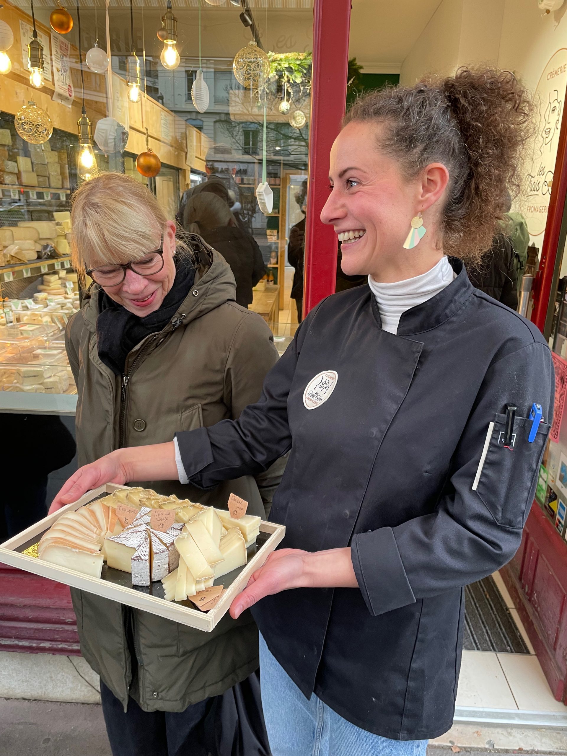 Danach war individuell viel frischer Luft/Kaffee/Süßes angesagt, bis wir uns am Nachmittag wieder in der kompakt-kleinen Fromagerie Les Trois Jean trafen. Angélique Anselmo führt den kleinen Laden mit einem kleinen Team und erzählte uns ihren Werdegang (sie hat ihn nach einer landwirtschaftlichen Ausbildung und dem vergeblichen Versuch einen eigenen Ziegenhof zu gründen, 2024 mit Hilfe von Christian Janier übernommen), während sie uns (aus Platzmangel auf dem Bürgersteig vor dem Laden, sehr cool) vier Käse von einer vorbereiteten Platte verkosten ließ. Danach hieß es: mit Käse für zuhause eindecken!