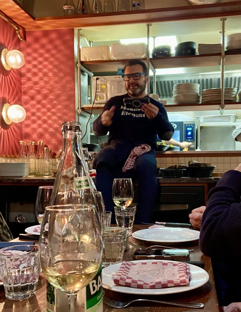 Im Anschluß hatte ein Teil der Gruppe einen ausgesprochenen guten Riecher, um einen Champagner-Apero in der Nähe unseres Hotels aufzutun, der Rest brauchte eine kurze Auszeit vor dem Abendessen im dritten Bouchon, unserem letzten, dem Bouchon des Filles, wo wir von Monsieur L’Elegant am Chef’s Table direkt an der Küche betreut wurden.