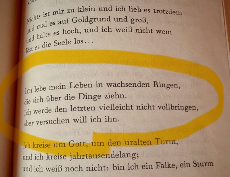Das stammt natürlich nicht von mir, sondern aus dem Ersten Buch vom Mönchischem Leben des höchst erstaunlichen Dichters Rainer Maria Rilke. 1875 in Prag geboren lebte er ganze fünf Jahrzehnte, europaweit, versuchte Fuß zu fassen, sich an einem Ring zu halten, um sich dann doch mit dem nächsten konfrontiert zu sehen. Stellte mehr Fragen als Antworten zu finden, war sich bewusst, dass beileibe nicht alles bewusst zu erfassen ist – und brachte das in Versen zum Ausdruck, die sich ganz offen zu schwärmender Romantik und Melancholie bekennen. Ihr merkt: mir gefällt das. Nicht zuletzt auch, weil Rilke sehr einfühlsam auch Geschmack und Duft in Worte fasst, Rosen, Äpfel. Für mich ist sein Werk in vieler Hinsicht ein perfektes Gegenmittel zu KI.