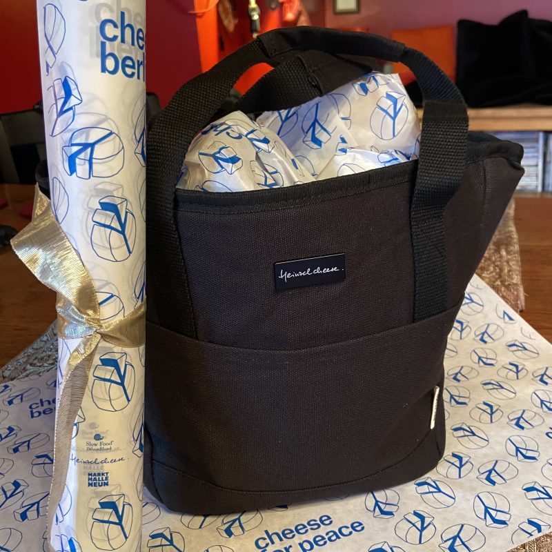 Erstens: die perfekte Käse-Isotasche. Aus recycelter Baumwolle, in schickem Schwarz, die Griffe und Maße gerade richtig, um sie elegant über der Schulter zu tragen. Stabil isoliert, so dass Eure Käseeinkäufe kühl bleiben, und mit einer Vortasche für Handy, Einkaufszettel etc. Mit : sechs Liter Inhalt ausreichend Platz für mindestens zehn hungrige Käsemäuler, Maße 29 x 25 x 15 cm, lässt sich flach zusammenlegen. Wird für 30 Euro Eure.