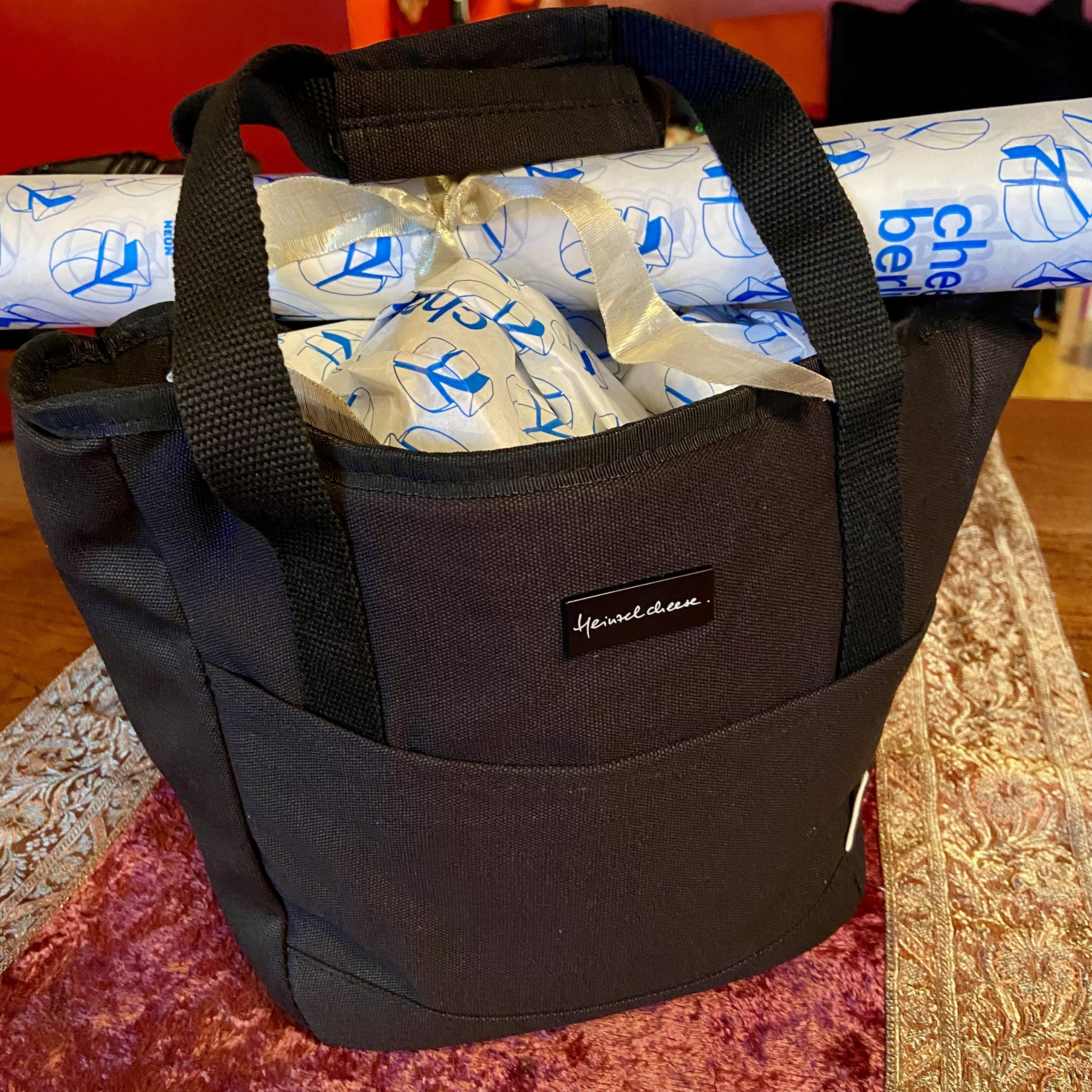 Erstens: die perfekte Käse-Isotasche. Aus recycelter Baumwolle, in schickem Schwarz, die Griffe und Maße gerade richtig, um sie elegant über der Schulter zu tragen. Stabil isoliert, so dass Eure Käseeinkäufe kühl bleiben, und mit einer Vortasche für Handy, Einkaufszettel etc. Mit : sechs Liter Inhalt ausreichend Platz für mindestens zehn hungrige Käsemäuler, Maße 29 x 25 x 15 cm, lässt sich flach zusammenlegen. Wird für 30 Euro Eure.